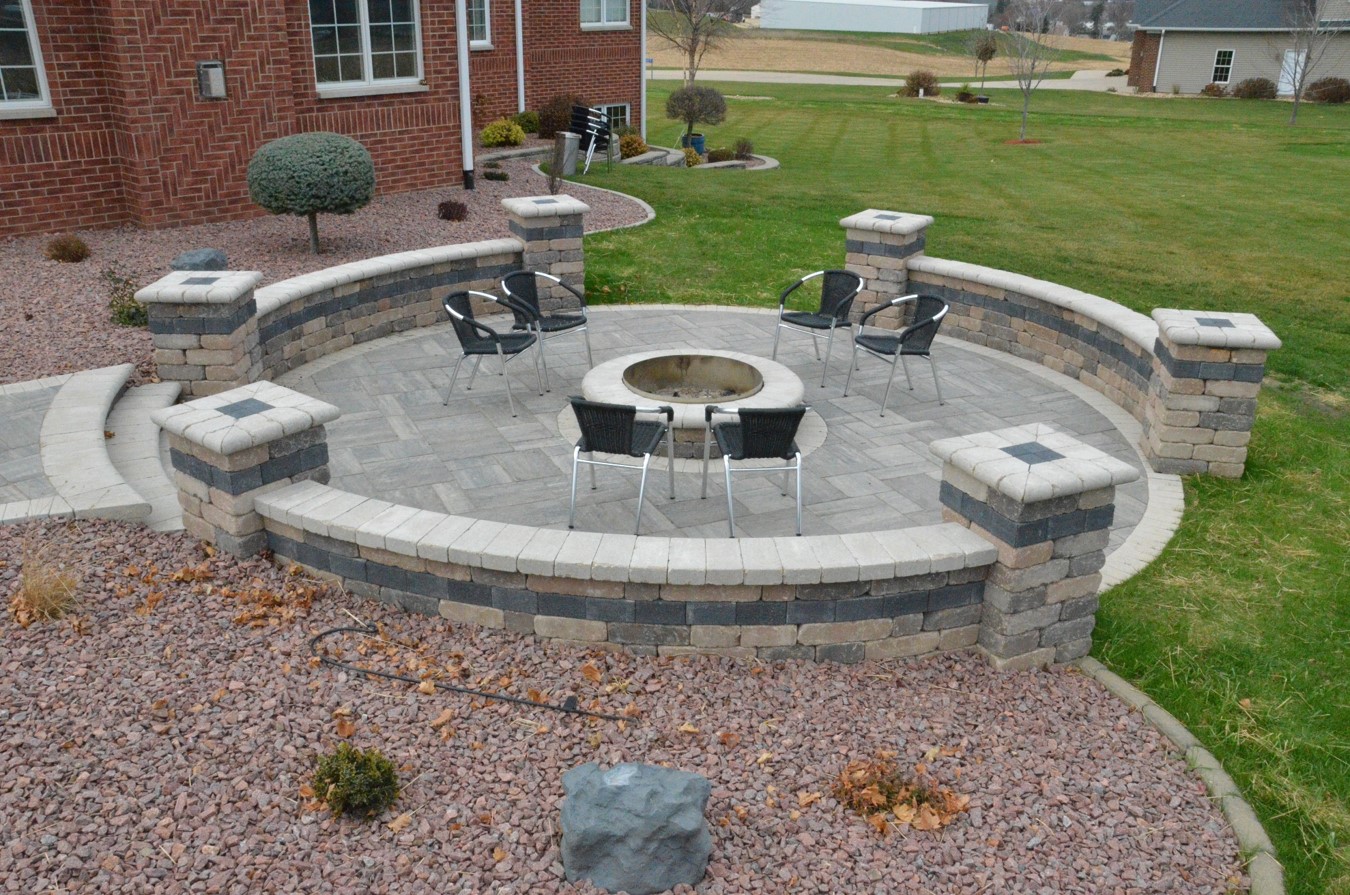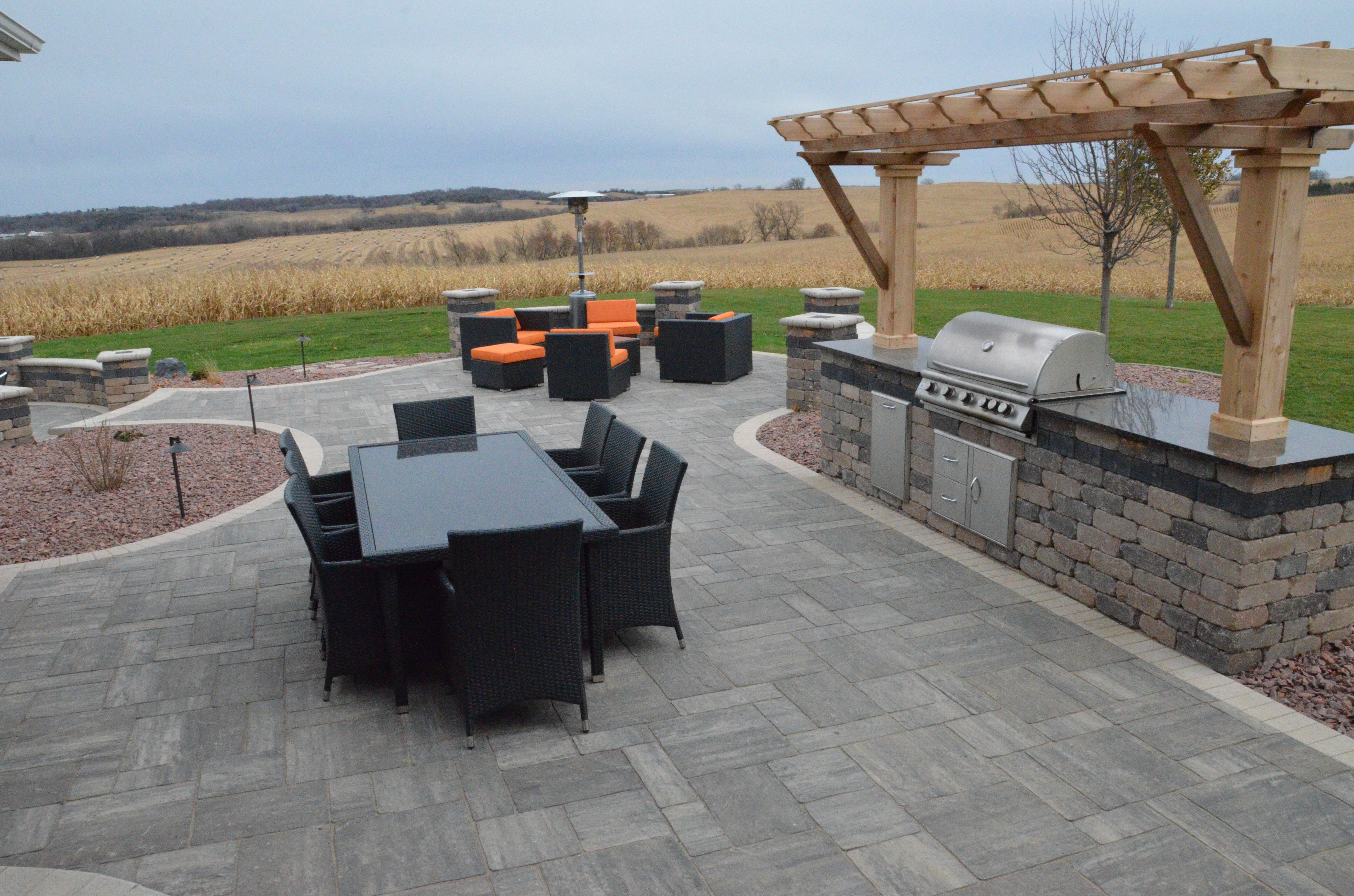 On the same level as the outdoor kitchen, we extended the paver patio into the yard to offer another seating area for the family. Their property is surrounding by beautiful, rolling crop ground with a scenic view of their small town and river, so we wanted to capitalize on their unique vantage point from this place in the yard. We leveled off that section of ground to provide a uniform base for the paver stones, but at a grade that allowed for water runoff and natural slope of the lawn.