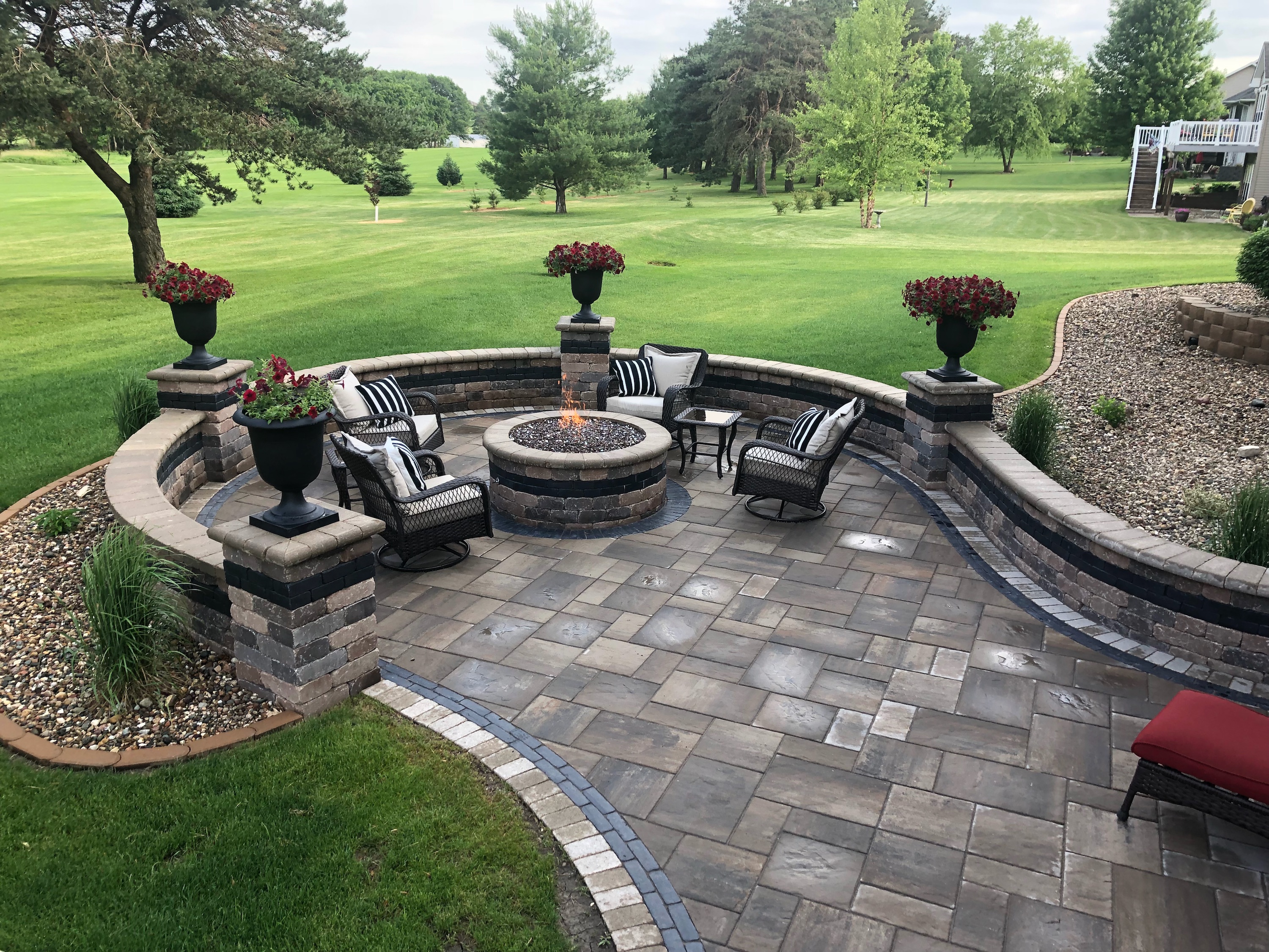 Once we had the immediate concerns addressed, we were able to draw up a design that would give our clients everything on their wish list. We leveled out the area in the center and installed a custom paver patio, complete with retaining walls that not only built up the surrounding shrub beds, but also provided extra seating around the new fire pit. Inside the retaining walls we also put in new low-voltage accent lights to accentuate the area well into the evening hours and draw the eye to all the design’s unique features.