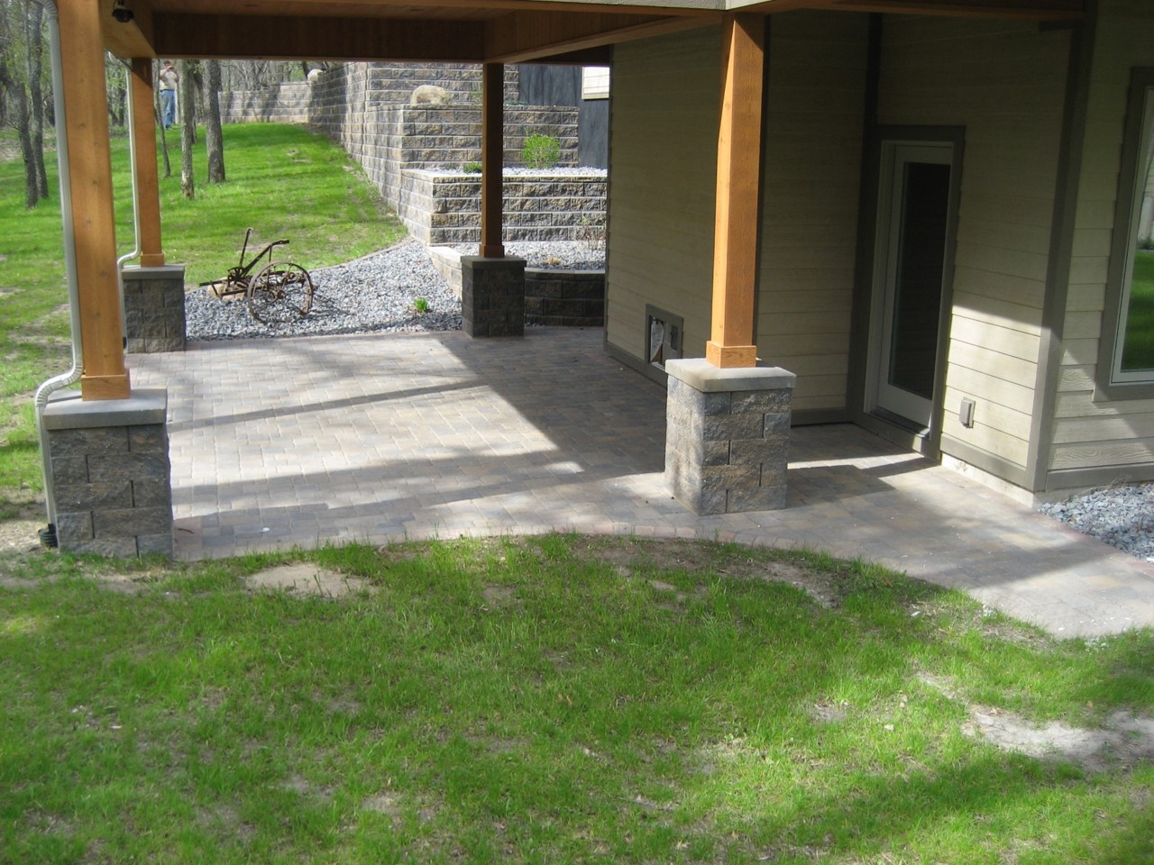 Patio with pillars to accent posts Take advantage of the space below your deck and create a paver patio and stone pillars. Like Loading...