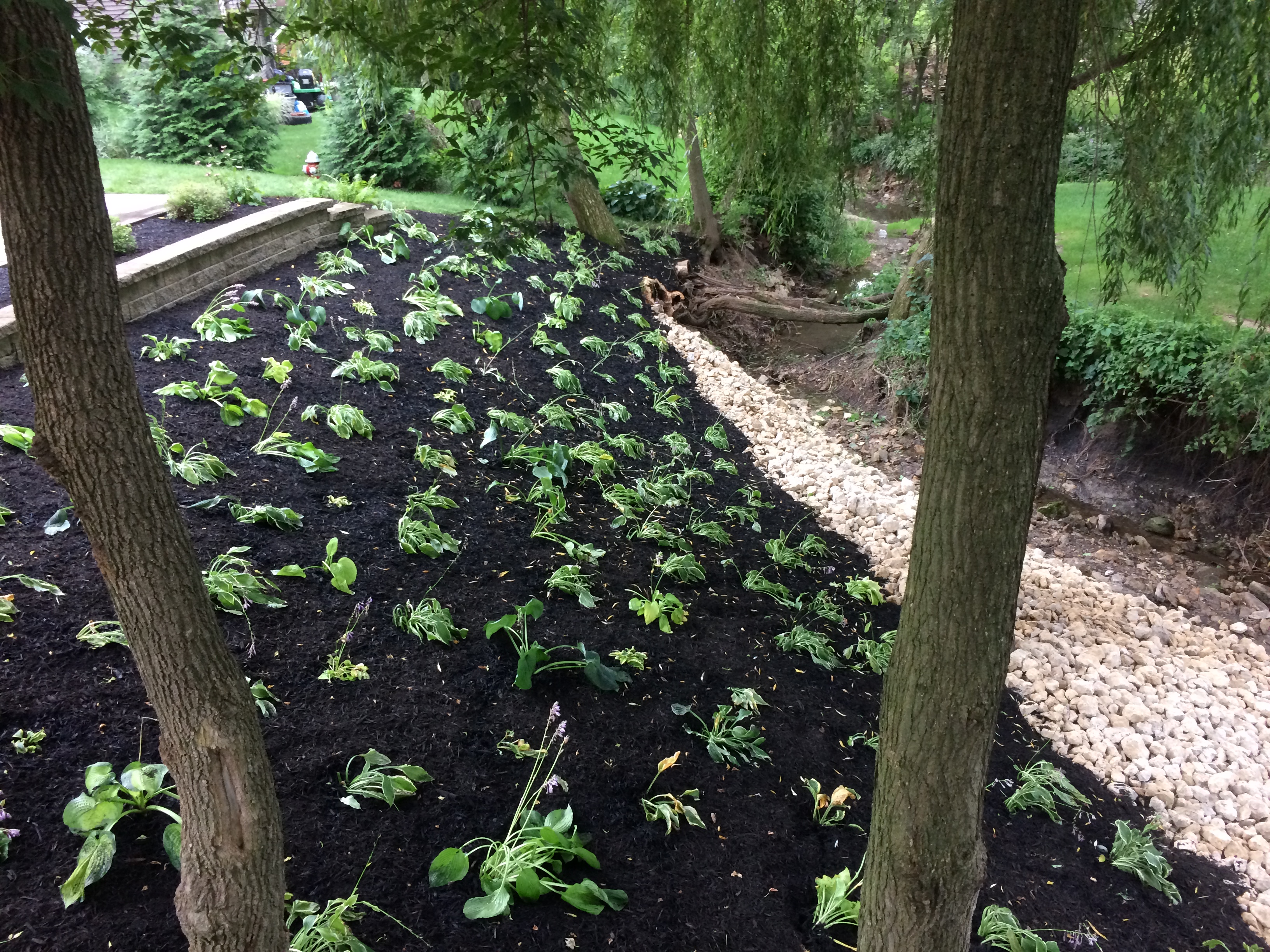 The creek at the back of this client’s property frequently rises and erodes the surrounding hill. To help, we at Schockemoehl installed natural rocks and a hosta bed to preserve the soil.